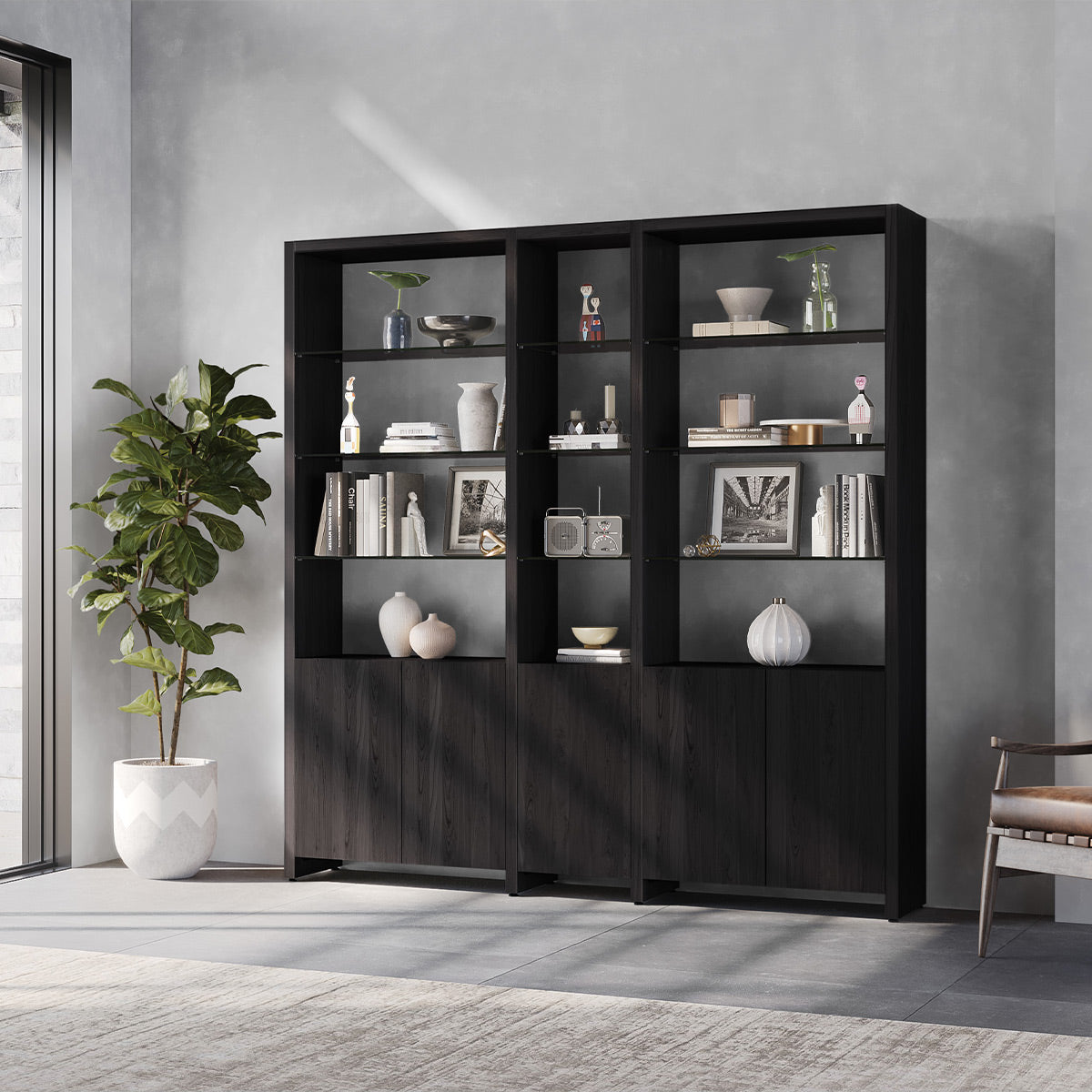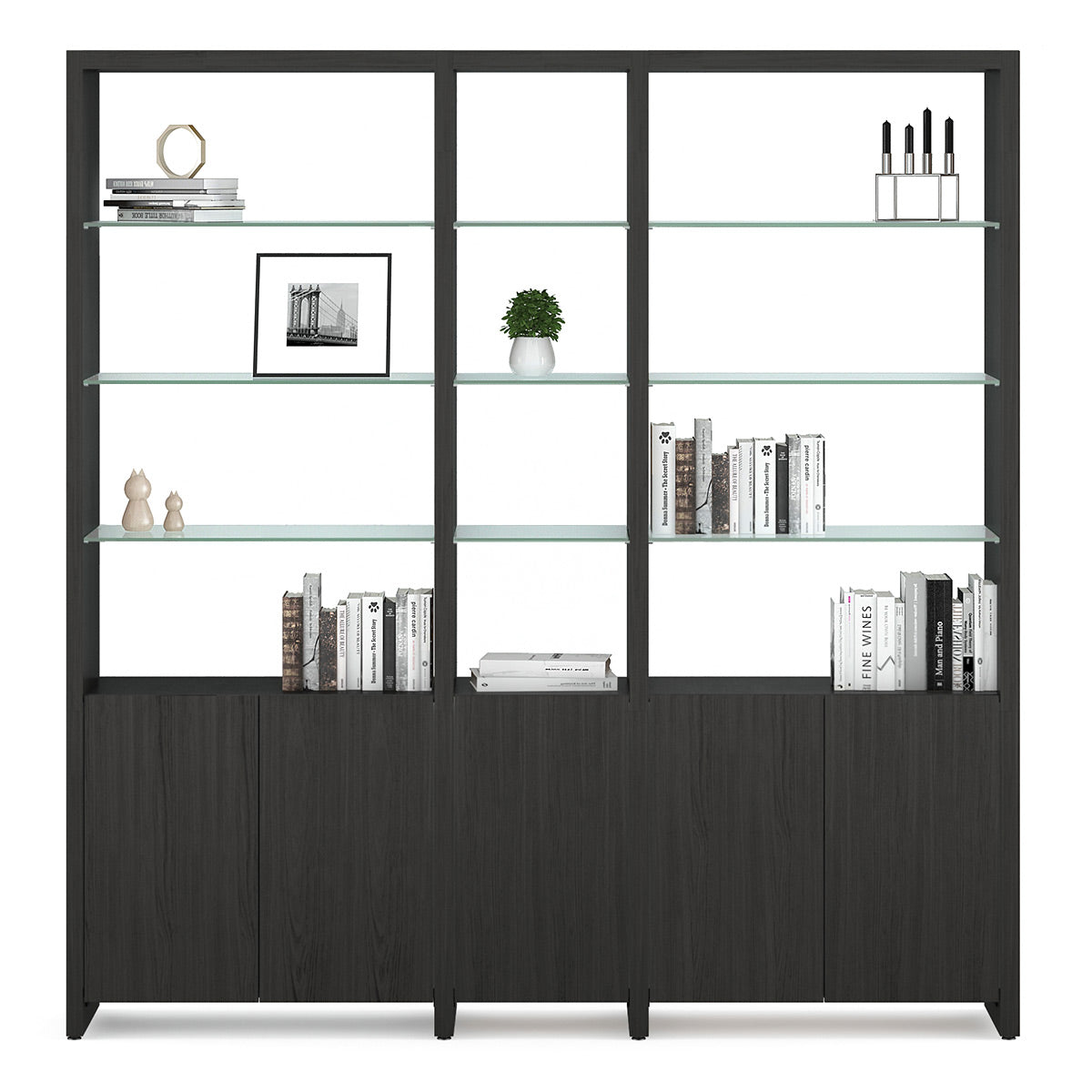 Fixed glass shelves float in the upper tier, ideal for a complete library or displaying a lifetime of treasures.