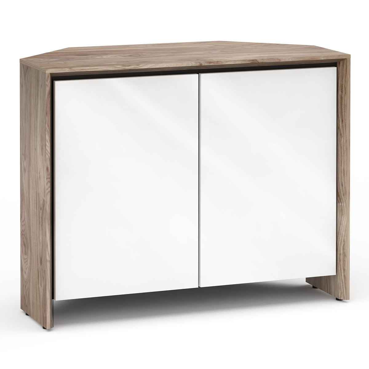 Clean, cutting-edge design with beveled edges and precision miter joints is highlighted by a natural walnut finish, and by an aluminum frame, and glass doors.